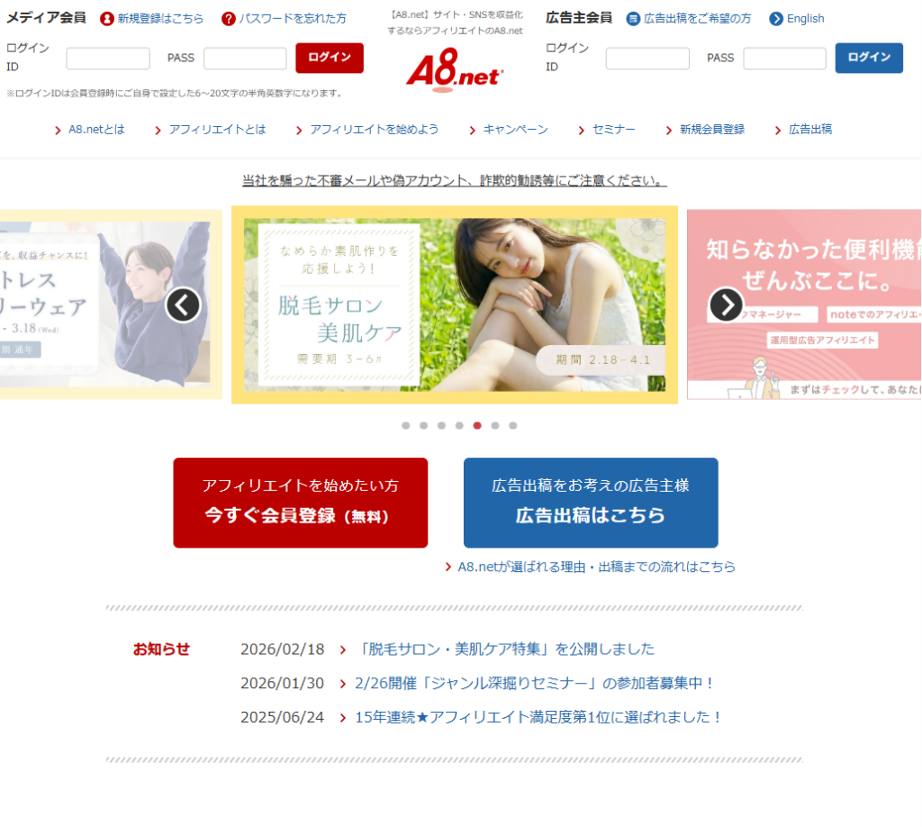 グルメ系や美容系など、案件が豊富なので、もし欲しい商品があったらA8.netで調べて、